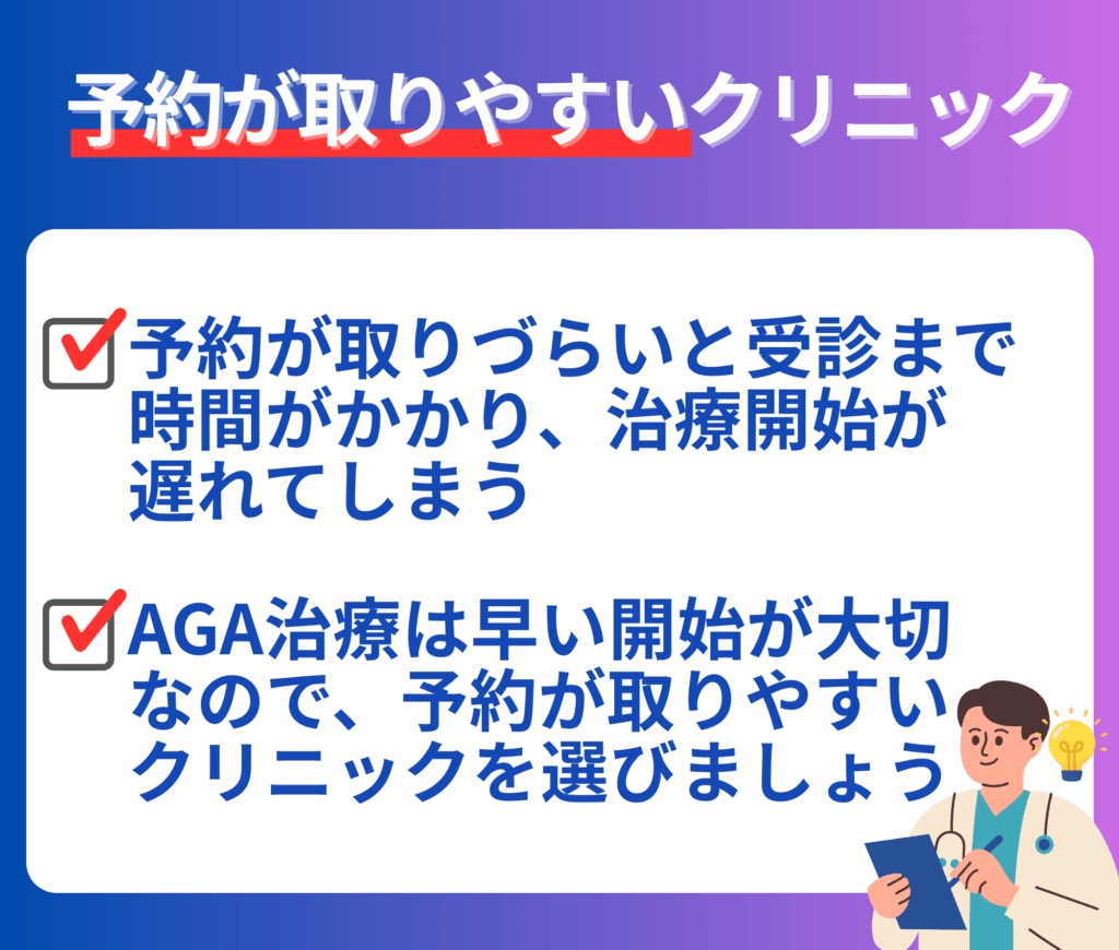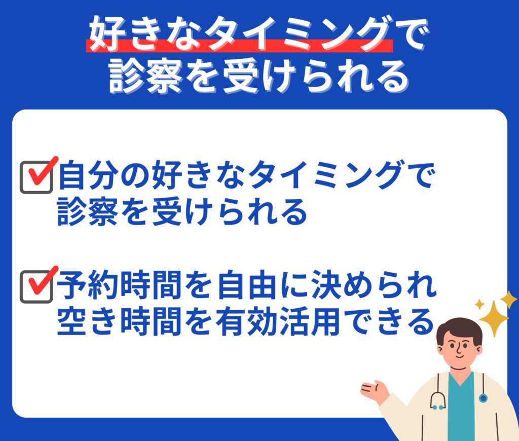 予約してから診察を受けるまでに時間がかかる場合もあるため、どの時間が空いているか事前に確認し、予約を入れるようにしてください。