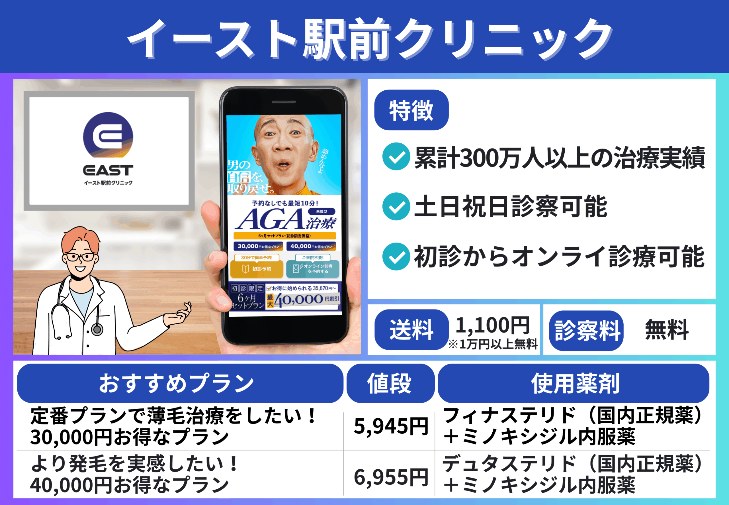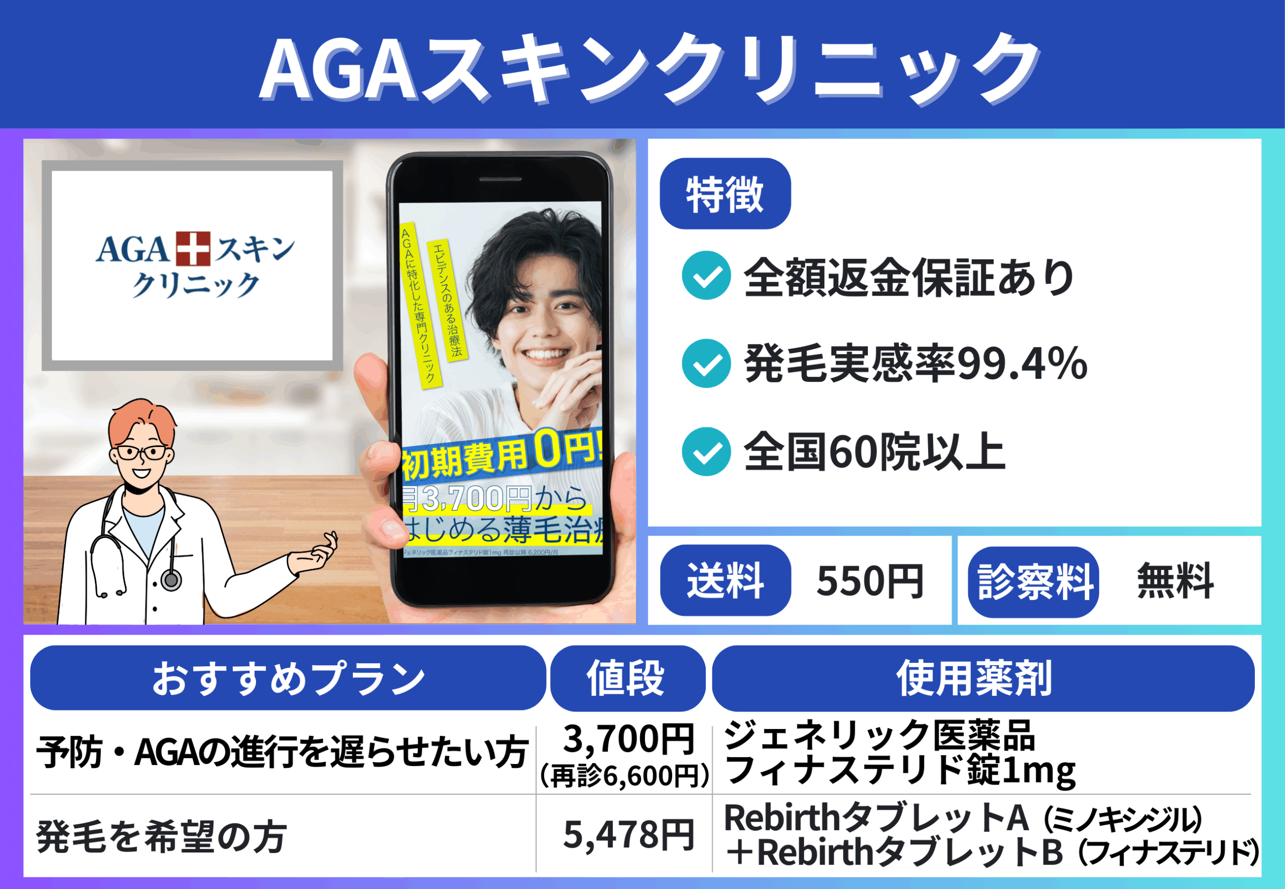 ![]() AGAスキンクリニック | 550円 | 薬 | ・自宅 ・来院 |