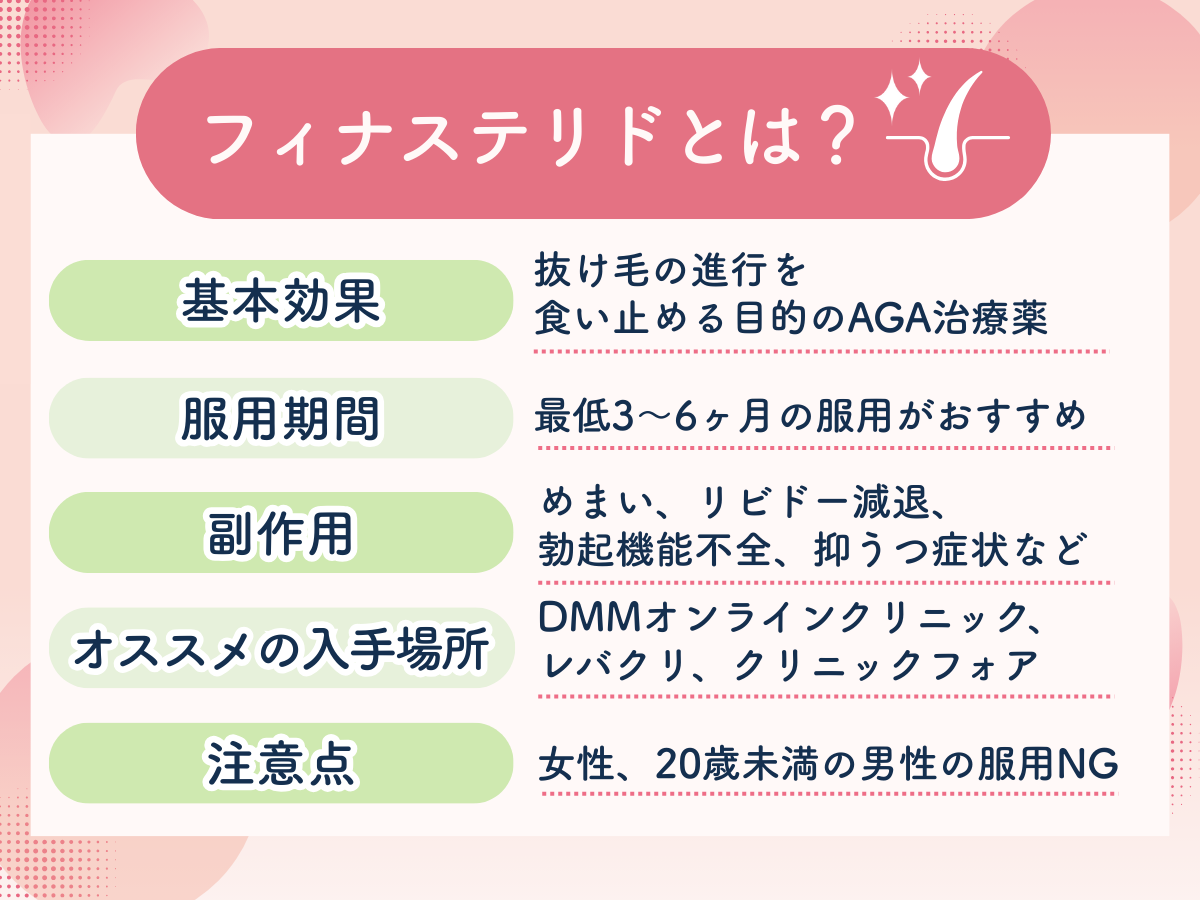 フィナステリドは、AGA(男性型脱毛症)による抜け毛の進行を止めるための薬です。