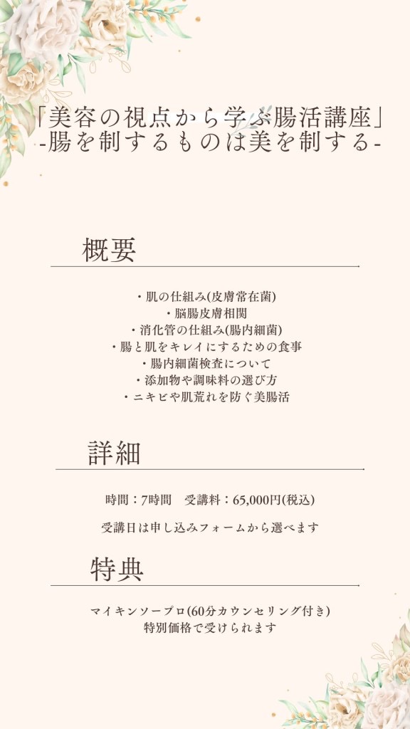 2025年6月18日 / 最終更新日時 : 2025年7月6日 yobou-cont 美容皮膚科クリニック様|腸活講座の制作サポート ▶ ご相談内容 「美容×腸活で実践できて生活に活かせる資格が欲しい」というご要望をいただきました。 特にエビデンスベースで知ってほしいという意識を持たれており、専門的な知見を取り入れた構成・作成のご相談をいただきました。 ▶ 当協会で対応した内容 ・肌腸相関を論文ベースに構成案のご提案 ・講座スライド、原稿の作成 ・講座の運営